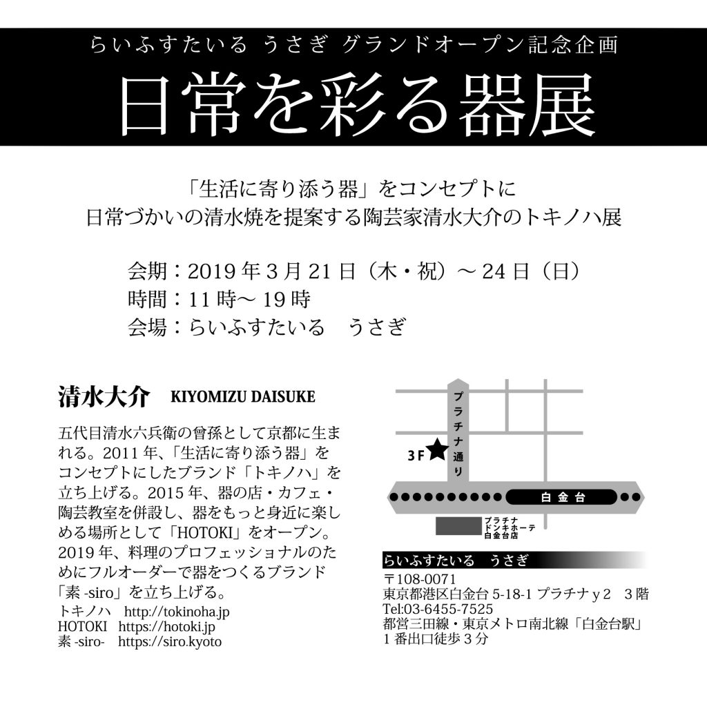 【イベント案内】2019年3月21日(木)〜24日(日)東京都白金台 らいふすたいる うさぎ様にてグランドオープン記念企画「日常を彩る器展」で トキノハ展を開催させていただきました。