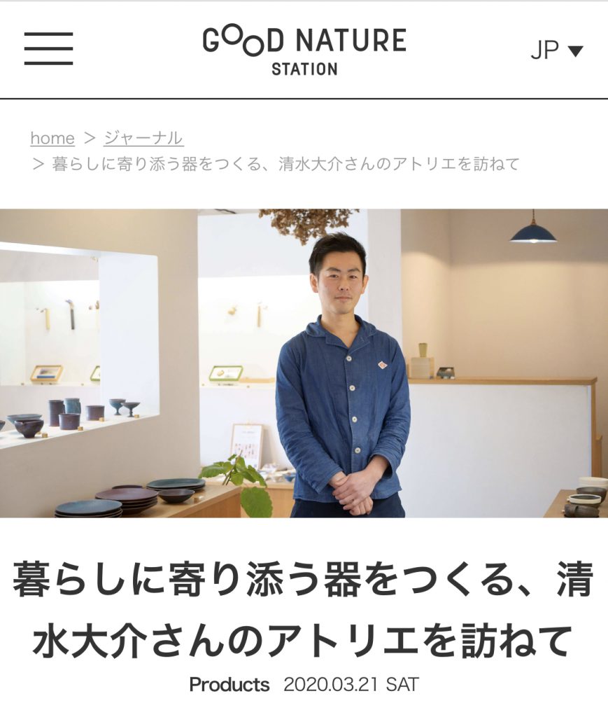 メインニュース 2020.03.26 【メディア掲載のお知らせ】GOOD NATURE JOURNALにて記事を掲載いただきました。 GOOD NATURE STATIONさんがWEBで配信されているGOOD NATURE JOURNALにて記事にしていただきました。 暮らしに寄り添う器をつくる、清水大介さんのアトリエを訪ねて